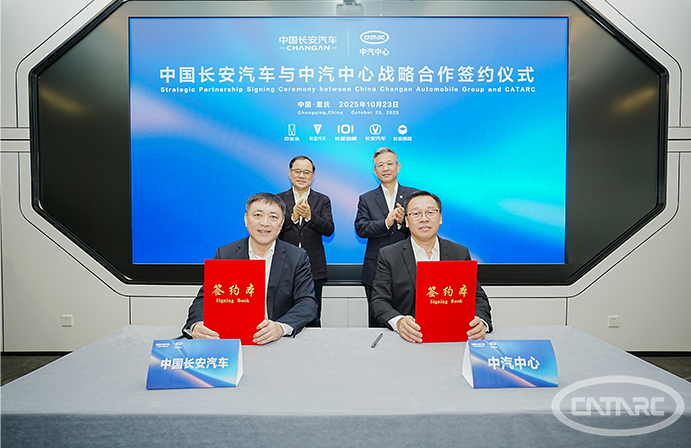 2025年10月23日,中汽中心與中國長安汽車集團有限公司(以下簡稱“中國長安汽車”)在重慶舉行戰略合作協議簽約儀式。中汽中心黨委書記、董事長安鐵成,中國長安汽車黨委書記、董事長朱華榮現場見證簽約,中汽中心黨委委員、副總經理周華,中國長安汽車黨委常委、副總經理鄧威分別代表雙方簽署協議。
